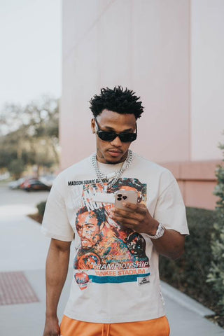 Our lifestyle collection captures the essence of some of the most iconic boxing events in history. The Iconic T's celebrate the rich heritage of the sweet science while blending seamlessly with the latest streetwear trends. Each piece is finished with our signature boxing glove laces on the bottom sides, a nod to the sport's origins, showcasing premium fashion inspired by boxing's timeless legacy.